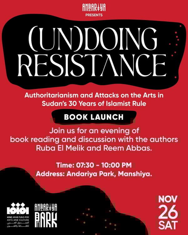 Andariya is thrilled to introduce its very first book: (UN)DOING RESISTANCE: Authoritarianism and Attacks on the Arts in Sudan’s 30 Years of Islamist Rule, written by Ruba El Melik and Reem Abbas. Below is the introduction chapter to give you a preview of the book. The book launch will be held at Andariya Park in Manshiya. Follow our social media pages @AndariyaMag to learn more and sign up for the event.